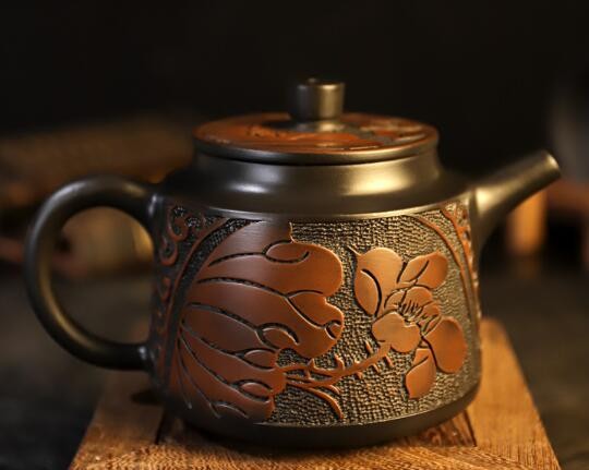 紫陶則是先將需要陶刻的內(nèi)容寫上去,濕坯雕刻,先陰刻后填泥,填泥也可以分為單色填泥和異色填泥,這樣稱作陰刻陽填。紫陶則需要成型之后,用鵝卵石純手工打磨去火皮,制成獨特的無釉磨光效果。